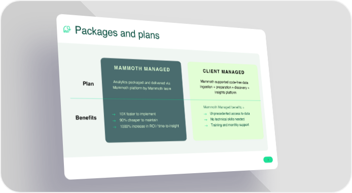 Benefits Analytics packaged and delivered via Mammoth platform by Mammoth team MAMMOTH MANAGED CLIENT MANAGED Mammoth supported code-free data ingestion + preparation + discovery + insights platform Plan Packages and plans 9 10X faster to implement 90% cheaper to maintain 1000% increase in ROI / time-to-insight Mammoth Managed bene fi ts + Unprecedented access to data No technical skills needed Training and monthly support