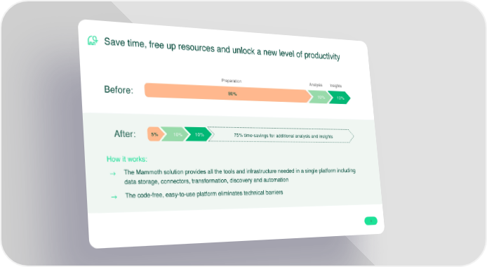 80% Preparation Analysis Insights 10% 10% 75% time-savings for additional analysis and insights 10% 10% 5% Save time, free up resources and unlock a new level of productivity Before: After: How it works: The Mammoth solution provides all the tools and infrastructure needed in a single platform including data storage, connectors, transformation, discovery and automation The code-free, easy-to-use platform eliminates technical barriers 4