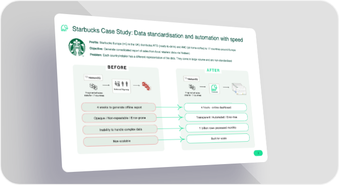 Profile : Starbucks Europe (HQ in the UK) distributes RTD (ready-to-drink) and AHC (at-home-coffee) to 17 countries around Europe Objective : Generate consolidated report of sales from local retailers (data via Nielsen) Problem : Each country/retailer has a different representation of the data. They come in large volume and are non-standardised Starbucks Case Study: Data standardisation and automation with speed Transparent / Automated / Error-free 4 hours - online dashboard BEFORE AFTER * * External Agency Fragmented sales data for 17 countries 1 billion row+ processed monthly Built for scale Fragmented sales data for 17 countries Opaque / Non-repeatable / Error-prone 4 weeks to generate offline report Inability to handle complex data Non-scalable 6