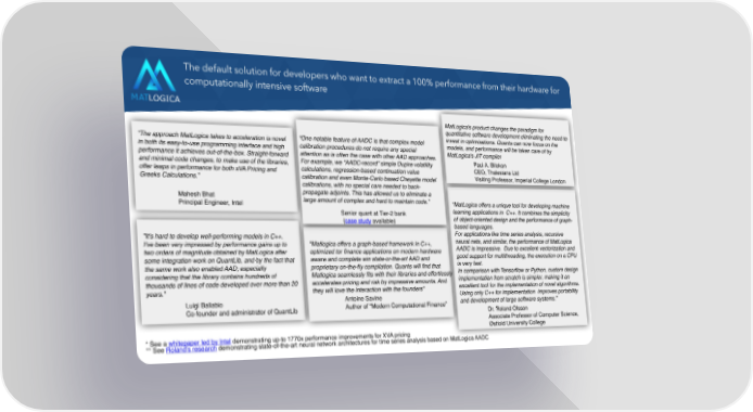 The default solution for developers who want to extract a 100% performance from their hardware for computationally intensive software “The approach MatLogica takes to acceleration is novel in both its easy-to-use programming interface and high performance it achieves out-of-the-box. Straight-forward and minimal code changes, to make use of the libraries, offer leaps in performance for both xVA Pricing and Greeks Calculations.” “One notable feature of AADC is that complex model calibration procedures do not require any special attention as is often the case with other AAD approaches. For example, we “AADC-record” simple Dupire volatility calculations, regression-based continuation value calibration and even Monte-Carlo based Cheyette model calibrations, with no special care needed to back- propagate adjoints. This has allowed us to eliminate a large amount of complex and hard to maintain code.” "MatLogica offers a unique tool for developing machine learning applications in C++. It combines the simplicity of object-oriented design and the performance of graph- based languages. For applications like time series analysis, recursive neural nets, and similar, the performance of MatLogica AADC is impressive. Due to excellent vectorization and good support for multithreading, the execution on a CPU is very fast. In comparison with Tensorflow or Python, custom design implementation from scratch is simpler, making it an excellent tool for the implementation of novel algorithms. Using only C++ for implementation improves portability and development of large software systems.” "Matlogica offers a graph-based framework in C++, optimized tor finance applications on modern hardware aware and complete win state-or-the-art AAD and proprietary on-the-fIy compilation. Quants will find that Matlogica seamlessly fits with their libraries and effortlessly accelerates pricing and risk by impressive amounts. And they will love the interaction with the founders" MatLogica's product changes the paradigm for quantitative software development eliminating the need to invest in optimisations. Quants can now focus on the models, and performance will be taken care of by MatLogica's JIT compiler "It's hard to develop well-performing models in C++. I've been very impressed by performance gains up to two orders of magnitude obtained by MatLogica after some integration work on QuantLib, and by the fact that the same work also enabled AAD; especially considering that the library contains hundreds of thousands of lines of code developed over more than 20 years." Mahesh Bhat Principal Engineer, Intel Senior quant at Tier-2 bank ( case study available) Dr. Roland Olsson Associate Professor of Computer Science, Østfold University College Paul A. Bilokon CEO, Thalesians Ltd Visiting Professor, Imperial College London Luigi Ballabio Co-founder and administrator of QuantLib Antoine Savine Author of “Modern Computational Finance” * See a whitepaper led by Intel demonstrating up-to 1770x performance improvements for XVA pricing ** See Roland’s research demonstrating state-of-the-art neural network architectures for time series analysis based on MatLogica AADC