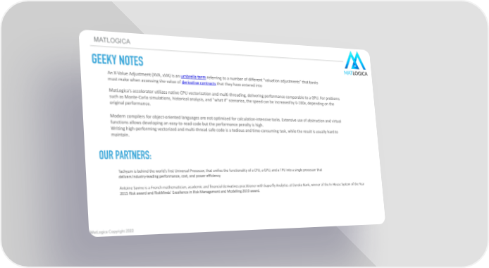 MatLogica Copyright 2022 MATLOGICA GEEKY NOTES An X-Value Adjustment (XVA, xVA) is an umbrella term referring to a number of different “valuation adjustments” that banks must make when assessing the value of derivative contracts that they have entered into Modern compilers for object-oriented languages are not optimized for calculation-intensive tasks. Extensive use of abstraction and virtual functions allows developing an easy-to-read code but the performance penalty is high. Writing high-performing vectorized and multi-thread safe code is a tedious and time-consuming task, while the result is usually hard to maintain. MatLogica’s accelerator utilizes native CPU vectorization and multi-threading, delivering performance comparable to a GPU. For problems such as Monte-Carlo simulations, historical analysis, and "what if" scenarios, the speed can be increased by 6-100x, depending on the original performance. OUR PARTNERS: Tachyum is behind the world’s first Universal Processor, that unifies the functionality of a CPU, a GPU, and a TPU into a single processor that delivers industry-leading performance, cost, and power efficiency Antoine Savine is a French mathematician, academic and financial derivatives practitioner with Superfly Analytics at Danske Bank, winner of the In-House System of the Year 2015 Risk award and RiskMinds’ Excellence in Risk Management and Modelling 2019 award.
