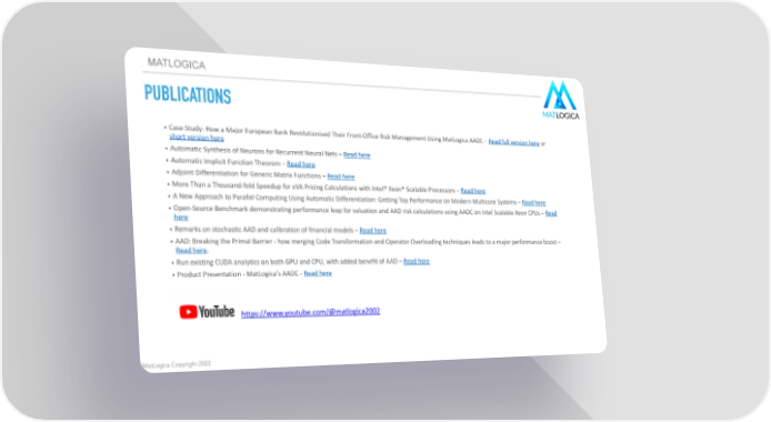 MatLogica Copyright 2022 MATLOGICA PUBLICATIONS • Case Study: How a Major European Bank Revolutionised Their Front-Office Risk Management Using MatLogica AADC – Read full version here or short version here • Automatic Synthesis of Neurons for Recurrent Neural Nets – Read here • Automatic Implicit Function Theorem – Read here • Adjoint Differentiation for Generic Matrix Functions – Read here • More Than a Thousand-fold Speedup for xVA Pricing Calculations with Intel® Xeon® Scalable Processors – Read here • A New Approach to Parallel Computing Using Automatic Differentiation: Getting Top Performance on Modern Multicore Systems – Read here • Open-Source Benchmark demonstrating performance leap for valuation and AAD risk calculations using AADC on Intel Scalable Xeon CPUs – Read here • Remarks on stochastic AAD and calibration of financial models – Read here • AAD: Breaking the Primal Barrier - how merging Code Transformation and Operator Overloading techniques leads to a major performance boost – Read here . • Run existing CUDA analytics on both GPU and CPU, with added benefit of AAD – Read here • Product Presentation - MatLogica's AADC - Read here https://www.youtube.com/@matlogica2002