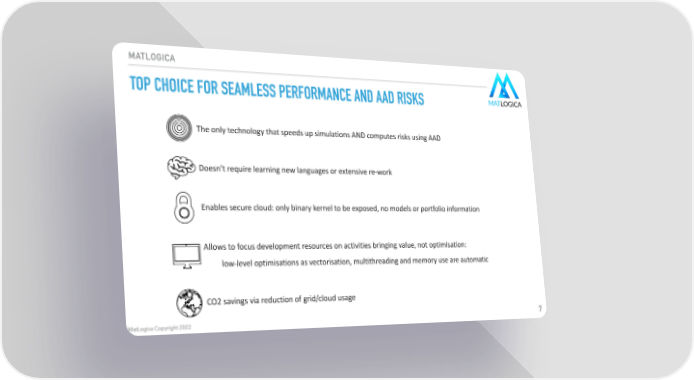 MatLogica Copyright 2022 MATLOGICA TOP CHOICE FOR SEAMLESS PERFORMANCE AND AAD RISKS 7 The only technology that speeds up simulations AND computes risks using AAD Doesn’t require learning new languages or extensive re-work Enables secure cloud: only binary kernel to be exposed, no models or portfolio information Allows to focus development resources on activities bringing value, not optimisation: low-level optimisations as vectorisation, multithreading and memory use are automatic CO2 savings via reduction of grid/cloud usage