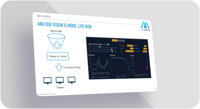 MatLogica Copyright 2022 MATLOGICA AND OUR VISION IS MORE: LIVE RISK 8 ‘Always on’ Kernel Market data Live prices & Risks Traders