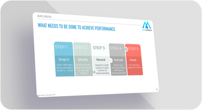 MatLogica Copyright 2021 MATLOGICA WHAT NEEDS TO BE DONE TO ACHIEVE PERFORMANCE 12 STEP 1 STEP 2 STEP 3 STEP 4 STEP 5 Drop-In Identify Record Execute Check Drop-in MatLogica library and replace ‘double’ to ‘ i double’ Identify and mark Inputs and Outputs for the target function Separate a single sample of target function for kernel recording Replace your normal workflow with flows to optimised kernels Run MatLogica diagnostics toolkit