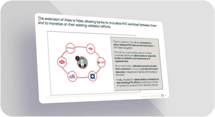 The extension of Atlas is Fides, allowing banks to mutualize KYC workload between them and to monetize on their existing validation efforts Fides is a platform that allows customers to share validated KYC data across institutions in the Fides ecosystem The solution is particularly relevant to large Corporate clients and allows banks to share the burden of validation and maintenance of regulated data Most importantly, it alleviates extensive burden from customers as they now provide and amend data once, irrespective of parties with access to that data Finally, the platform allows banks to monetize on their existing KYC efforts by electing to charge 3rd parties for access to their validating stamps Fintech Lab - Confidential copy 5