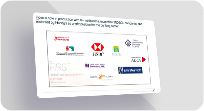 norbloc - Pitch Deck Page 5 Page 7Fides is now in production with 8+ institutions, more than 200,000 companies and endorsed by Moody’s as credit positive for the banking sector! Fintech Lab - Confidential copy 6