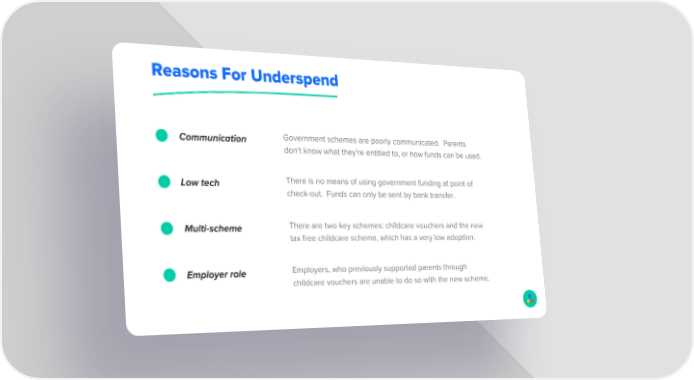 Reasons For Underspend Communication Government schemes are poorly communicated. Parents don’t know what they’re entitled to, or how funds can be used. Low tech There is no means of using government funding at point of check-out. Funds can only be sent by bank transfer. Multi-scheme There are two key schemes: childcare vouchers and the new tax free childcare scheme, which has a very low adoption. Employer role Employers, who previously supported parents through childcare vouchers are unable to do so with the new scheme.