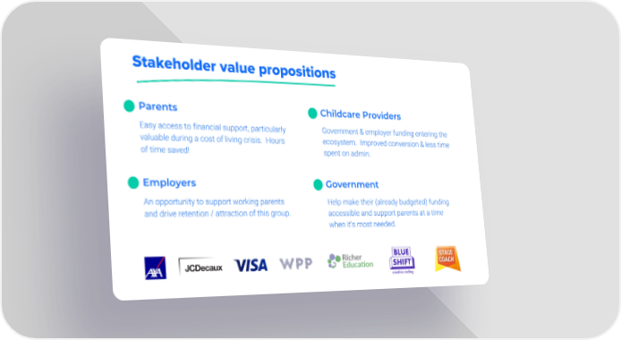 Stakeholder value propositions Parents Childcare Providers Easy access to financial support, particularly Government & employer funding entering the valuable during a cost of living crisis. Hours ecosystem. Improved conversion & less time of time saved! spent on admin. Employers Government An opportunity to support working parents Help make their (already budgeted) funding and drive retention / attraction of this group. accessible and support parents at a time when it’s most needed.