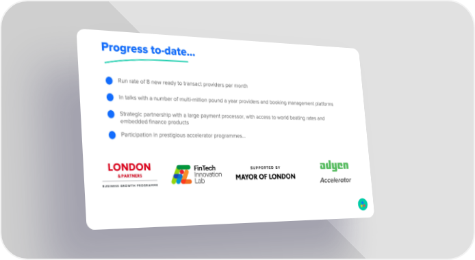 Progress to-date… Run rate of 8 new ready to transact providers per month In talks with a number of multi-million pound a year providers and booking management platforms Strategic partnership with a large payment processor, with access to world beating rates and embedded finance products Participation in prestigious accelerator programmes… Accelerator