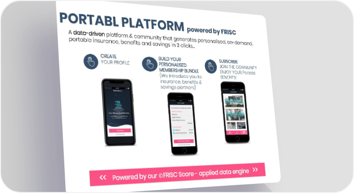 PORTABL PLATFORM powered by FRISC A data-drivenplatform & community that generates personalised, on-demand, portable insurance, benefits and savings in 3 clicks... CREATE BUILD YOUR SUBSCRIBE YOUR PROFILE PERSONALISED JOIN THE COMMUNITY MEMBERSHIP BUNDLE ENJOY YOUR Portabl (We introduce you to BENEFITS! insurance, benefits & savings partners) << Powered by our ©FRISC Score - applied data engine >>
