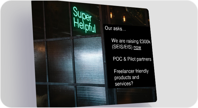 Our asks… ✓ We are raising £300k (SEIS/EIS) now ✓ POC & Pilot partners ✓ Freelancer friendly products and services?