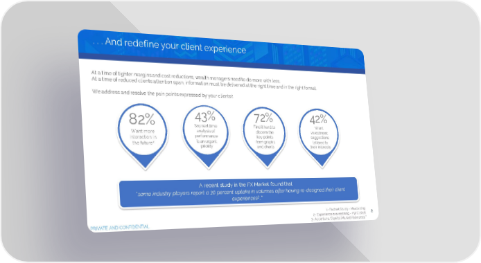 . . . And redefine your client experience At a time of tighter margins and cost reductions, wealth managers need to do more with less. At a time of reduced clients attention span, information must be delivered at the right time and in the right format. We address and resolve the pain points expressed by your clients1: 43% 82% 72% 42% Say real time Find it hard to Want Want more analysis of discern the investment interaction in performance key points suggestions the future2 is an urgent from graphs tailored to priority and charts their interests A recent study in the FX Market found that “some industry players report a 30 percent uptake in volumes after having re-designed their client 3 experiences ." 1- Factset Study - March 2019 8 2- Experience is everything - PWC 2018 PRIVATE AND CONFIDENTIAL 3- Accenture, “Capital Market Vision 2022”