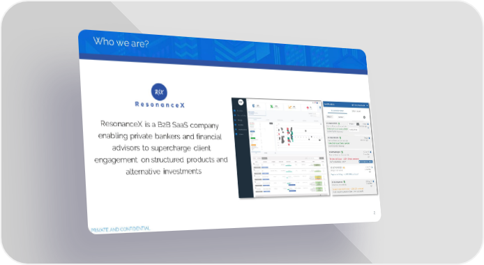 ResonanceX - Pitch Deck Page 1 Page 3Who we are? ResonanceX is a B2B SaaS company enabling private bankers and financial advisors to supercharge client engagement on structured products and alternative investments 2 PRIVATE AND CONFIDENTIAL