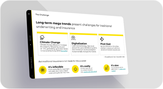 Sales Deck Copyright Riskwolf AG Long-term mega trends present challenges for traditional underwriting and insurance The Challenge 2 It’s costly 35-40% cost ratio of incumbent insurers (e.g. Lloyd’s cost ratio 2022 ) It’s slow 4-6 months for claims settlement (in Cyber up to 3 years ) It’s inflexible A one-policy-fits-it-all approach with static and history based underwriting fails for new risks But traditional insurance is not made for this purpose: Climate Change Climate change effects will increase the property risk pool by around 33‒41%, generating up to USD 183 bn in new premiums by 2040 ( SwissRe ). Digitalization Cyber and technology risks could account for up to USD 80 bn by 2040. New trends such as cloud adoption fundamentally changes the market. Pivot East By 2040 $560 bn or 13% of the premium volume will shift from advanced markets towards east. + 16 additional new insurable risks