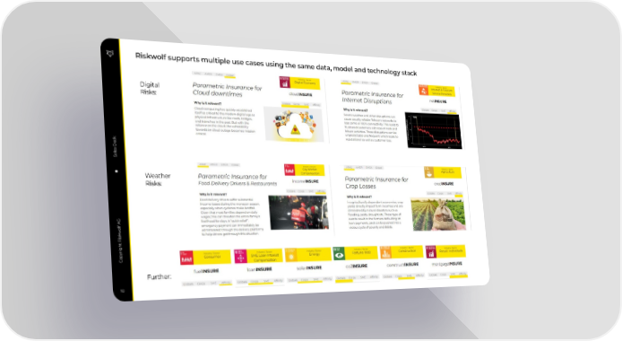 Riskwolf Pitch Deck Page 9 Page 11Sales Deck Copyright Riskwolf AG Riskwolf supports multiple use cases using the same data, model and technology stack 10 Further: Digital Risks: Weather Risks: