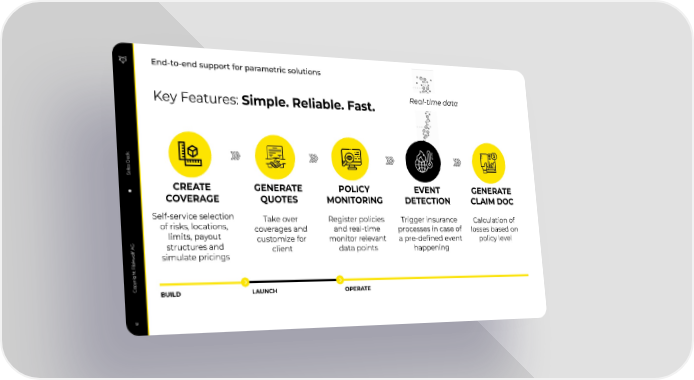 Sales Deck Copyright Riskwolf AG End-to-end support for parametric solutions 9 CREATE COVERAGE Self-service selection of risks, locations, limits, payout structures and simulate pricings GENERATE QUOTES Take over coverages and customize for client POLICY MONITORING Register policies and real-time monitor relevant data points EVENT DETECTION Trigger insurance processes in case of a pre-defined event happening GENERATE CLAIM DOC Calculation of losses based on policy level Real-time data Key Features: Simple. Reliable. Fast. LAUNCH BUILD OPERATE