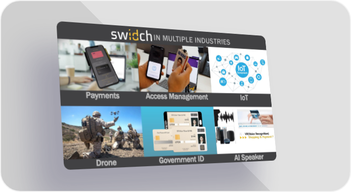 IN MULTIPLE INDUSTRIES Payments Access Management IoT Drone Government ID AI Speaker swIDch - Pitch Deck Page 8 Page 10