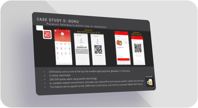 CASE STUDY 5: DOKU Payment Gateway/e-wallet app in Indonesia Dynamic Dynamic App Authentication & ID QR Payment • DOKU(doku.com) is one of the top five e-wallet apps/payment gateways in Indonesia • 3 million downloads • 260,000 active users using swIDch technology • In unstable network environment, eliminate user discomfort and improve system safety and security • This feature will be applied at the USIM level in the future, and will be a pre-paid Wallet with telcos