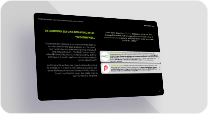 The FinTech Impact Report: Working through the world’s to-do list #FinTechforPlanet 04 | MOVING BEYOND BEHAVING WELL From 2024, more than ~50,000 companies in Europe, and thousands in the UK, will be required to report their outward TO DOING WELL material impacts on society, and biodiversity and environment (under EU CSRD).53 Sustainable development areas beyond climate need to be considered for the good of society and the planet, such as biodiversity, water and the social impacts of inequality and poverty. The Task Force on Nature- Nurture the World: Uniting humanitarian, financial and technology sectors, F4ID related Financial Disclosures (TNFD) is currently drafting provides a digital supply and payments platform for aid organisations, enabling local vendors to give life-saving assistance to vulnerable households in the most hostile a framework that will help financial institutions identify environments. Through its LOTUS20 pilot programme in Kenya, Afghanistan and 52 Nigeria, 170+ tonnes of food reached 10,000 people, with every transaction nature-related risks. tracked in real-time. As this agenda evolves, new opportunities will continue Connect to Charities Percent gives non-profits access to fundraising options and to emerge for FinTechs to not just behave well, but also discounted tech products through partnerships. Its global disbursement system to be the financial services enablers that help others to enables businesses to integrate fundraising into its platform, with the ability to do well regarding the issues that matter most to disburse funds to over 5.7 million non-profits across 200+ countries. communities and the planet. 32