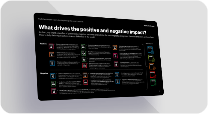 The FinTech Impact Report: Working through the world’s to-do list #FinTechforImpact What drives the positive and negative impact? In short, we found a number of positive and negative traits that characterise the most impactful companies. Founders and CEOs can learn from these to help their organizations make a difference in the world. Impact Categories: Positive + Economic growth with scaled distribution + Sustainable financing for the things that matter + Regional offices to boost local economies (e.g. PEOPLE (e.g. available to a wider user base through Icon (e.g. the energy transition, affordable homes, and Icon access to new skill pools, job creation, taxes, Icon partnerships, rather than through self-build investment in SMEs) university collaborations, city cultures and uplifted which duplicates the industry effort) communities) + Simplified online presence end efficiency by + Inclusive services with low barriers to entry, served + Efficient infrastructure services (e.g. Icon design (i.e. low-energy-consumption websites at the point of need (i.e. minimal data requirements, embedded finance, banking-as-a-service rails and data processing) Icon convenient hours of service, low fees and PLANET Icon that boost productivity and enable wider consciously serving deprived regional areas and ecosystem capability and resilience) + Transparency of positive impact on the Planet fairly including minority groups) Icon (and across all dimensions e.g. climate, nature + Robust compliance and accountability (e.g. and society) + Financial education (i.e. open-access, non- to reduce illicit flows of finance through + Alternative lending models for wider, more presumptive, inclusively designed services PLACE digital ID, KYC and AML) Icon inclusive access to credit (e.g. based on Open particularly for underserved groups or available in Banking account transactions, rather than deprived regions) traditional agency credit scores) Negative × Lack of transparency (e.g. use of complex × Scaled data processing without lean algorithms × Limited governance and protection against fraud PRODUCTIVITY financial engineering, missing disclosures for Icon or purging of historically unused storage (e.g. avoiding gaps in governance and controls ESG decisions, a lack of cross-industry (particularly if not offset by the use of green caused by scaling too rapidly) collaboration and weak AML/fraud controls) energy and clean water programmes) × Funding industries that negatively impact × Innovations that drive up the cost of doing × Operating in unregulated domains (e.g. without SDGs (e.g. financing ‘business as usual’ Icon business or move affordability beyond the reach sufficient proactive industry engagement or PEACE natural resource exploitation and other tier 3 of the masses (e.g. property trading or customer protections to minimise financial stability heavy greenhouse gas emitters) inaccessible investment vehicles) risks posed by emerging innovations) × Losing focus on purpose and impact as scale takes over (e.g. business models focused primarily on Icon productivity, economic benefits and short-term shareholder returns rather than being balanced towards driving an increasingly positive impact on People, Planet, Place and Peace) 53