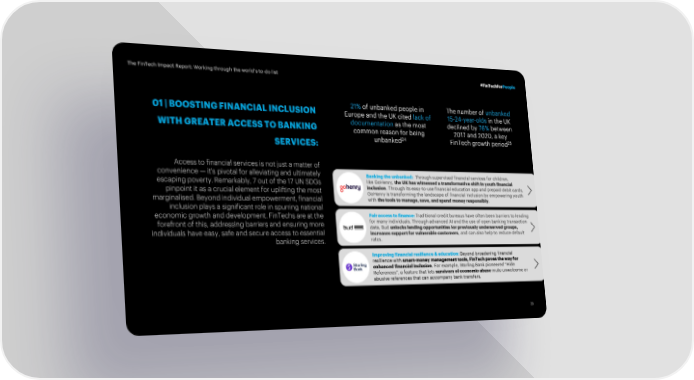 The FinTech Impact Report: Working through the world’s to-do list #FinTechforPeople 01 | BOOSTING FINANCIAL INCLUSION 21% of unbanked people in The number of unbanked Europe and the UK cited lack of 15-24-year-olds in the UK WITH GREATER ACCESS TO BANKING documentationas the most declined by 76% between common reason for being 2017 and 2020, a key SERVICES: unbanked24 FinTech growth period25 Access to financial services is not just a matter of convenience — it's pivotal for alleviating and ultimately Banking the unbanked: Through supervised financial services for children, escaping poverty. Remarkably, 7 out of the 17 UN SDGs like GoHenry, the UK has witnessed a transformative shift in youth financial pinpoint it as a crucial element for uplifting the most inclusion. Through its easy-to-use financial education app and prepaid debit cards, GoHenry is transforming the landscape of financial inclusion by empowering youth marginalised. Beyond individual empowerment, financial with the tools to manage, save, and spend money responsibly. inclusion plays a significant role in spurring national economic growth and development. FinTechs are at the Fair access to finance: Traditional credit bureaus have often been barriers to lending forefront of this, addressing barriers and ensuring more for many individuals. Through advanced AI and the use of open banking transaction individuals have easy, safe and secure access to essential data, Bud unlocks lending opportunities for previously underserved groups, increases support for vulnerable customers, and can also help to reduce default banking services. rates. Improving financial resilience & education: Beyond broadening financial resilience with smart-money management tools, FinTech paves the way for enhanced financial inclusion. For example, Starling Bank pioneered “Hide References”, a feature that lets survivors of economic abuse mute unwelcome or abusive references that can accompany bank transfers. 23