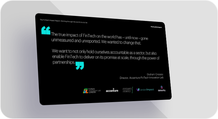 The FinTech Impact Report: Working through the world’s to-do list #FinTechforImpact The true impact of FinTech on the world has – until now – gone “unmeasured and unreported. We wanted to change that. We want to not only hold ourselves accountable as a sector, but also “ enable FinTech to deliver on its promise at scale, through the power of partnerships. Graham Cressey Director, Accenture FinTech Innovation Lab