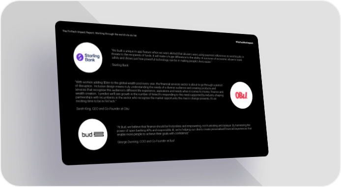 The FinTech Impact Report: Working through the world’s to-do list #FinTechforImpact “We built a unique in-app feature when we were alerted that abusers were using payment references to send insults or threats to the recipients of funds. It will make a huge difference to the ability of survivors of economic abuse to bank safely and shows just how powerful technology can be in making people’s lives easier.” Starling Bank “With women adding $5trn to the global wealth pool every year, the financial services sector is about to go through a period of disruption. Inclusive design means truly understanding the needs of a diverse audience and creating products and services that recognise this audience’s different life experience, aspirations and needs when it comes to money, finance and wealth creation. I predict we'll see growth in the number of fintech's responding to this need supported by industry-shaping partnerships with incumbents in the sector who recognise the market opportunity this macro change presents. It's an exciting time to be in FinTech.” Sarah King, CEO and Co-Founder at Obu “At Bud, we believe that finance should be frictionless and empowering, not frustrating and opaque. By harnessing the power of open banking APIs and responsible AI, we're helping our clients create personalised financial experiences that enable more people to achieve their goals with confidence." George Dunning, COO and Co-Founder at Bud 62