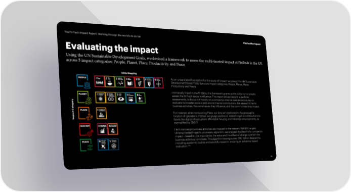 The FinTech Impact Report: Working through the world’s to-do list #FinTechforImpact Evaluating the impact Using the UN Sustainable Development Goals, we devised a framework to assess the multi-faceted impact of FinTech in the UK across 5 impact categories: People, Planet, Place, Productivity and Peace SDGs Mapping PEOPLE As an unparalleled foundation for the study of ‘impact’ we placed the UN Sustainable Development Goals103 into five core impact categories: People, Planet, Place, Productivity and Peace. Intrinsically linked to the 17 SDGs, this framework grants us the ability to holistically PLANET assess the FinTech sector's influence. This report delves beyond superficial yr assessments, to focus not merely on a company's internal operations but also to og evaluate its broader societal and environmental contributions. We assess FinTechs’ eat business activities, the social issues they influence, and the communities they impact. Ct PLACE c For instance, when considering Place, our lens isn't restricted to the geographic pa location of operations. Instead, we gauge positive or indeed negative contributions to Im facets like digital infrastructure, affordable housing and industrial enhancements, as exemplified by SDG 11. PRODUCTIVITY Each company's business activities are mapped to the relevant 169 SDG targets. Utilising Vested Impact’s proprietary algorithm, we analysed the depth of a company's impact – based on the importance, the value and the effect of change to which the PEACE business activities contribute. This algorithm leverages over 300 million data points, including academic studies and scientific research, ensuring an evidence-based evaluation.104 60 60