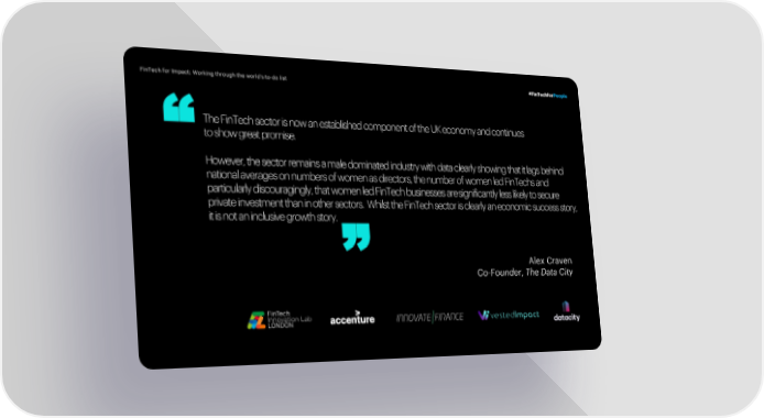 FinTech for Impact: Working through the world’s to-do list #FinTechforPeople The FinTech sector is now an established component of the UK economy and continues to show great promise. “ However, the sector remains a male dominated industry with data clearly showing that it lags behind national averages on numbers of women as directors, the number of women led FinTechs and particularly discouragingly, that women led FinTech businesses are significantly less likely to secure “ private investment than in other sectors. Whilst the FinTech sector is clearly an economic success story, it is not an inclusive growth story. Alex Craven Co-Founder, The Data City