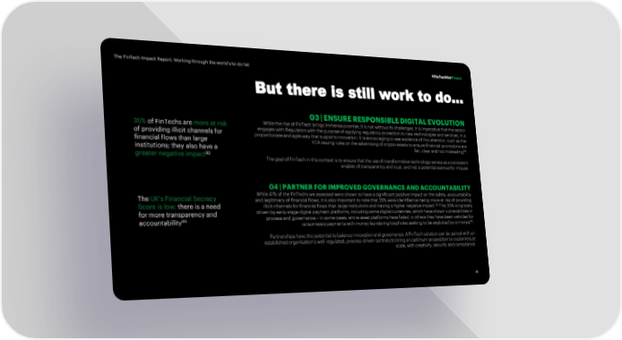The FinTech Impact Report: Working through the world’s to-do list #FinTechforPeace But there is still work to do… 03 | ENSURE RESPONSIBLE DIGITAL EVOLUTION 35% of FinTechs are more at risk While the rise of FinTech brings immense promise, it is not without its challenges. It is imperative that the sector of providing illicit channels for engages with Regulators with the purpose of applying regulatory protection to new technologies and services, in a financial flows than large proportionate and agile way that supports innovation. It is encouraging to see evidence of this attention, such as the FCA issuing rules on the advertising of crypto-assets to ensure financial promotions are 94 institutions; they also have a fair, clear and not misleading . greater negative impact92 The goal of FinTech in this context is to ensure that the use of transformative technology serves as a consistent enabler of transparency and trust, and not a potential avenue for misuse. 04 | PARTNER FOR IMPROVED GOVERNANCE AND ACCOUNTABILITY The UK’s Financial Secrecy While 41% of the FinTechs we assessed were shown to have a significant positive impact on the safety, accountability and legitimacy of financial flows, it is also important to note that 35% were identified as being more at risk of providing Score is low; there is a need illicit channels for financial flows than large institutions and having a higher negative impact.95 This 35% is typically for more transparency and driven by early-stage digital payment platforms, including some digital currencies, which have shown vulnerabilities in 93 process and governance – in some cases, entire asset platforms have failed, in others they have been vehicles for accountability 96 ransomware payments with money laundering loopholes seeking to be exploited by criminals . Partnerships have the potential to balance innovation and governance. A FinTech solution can be paired with an established organisation’s well-regulated, process-driven controls to bring an optimum proposition to customers at scale, with creativity, security and compliance. 48