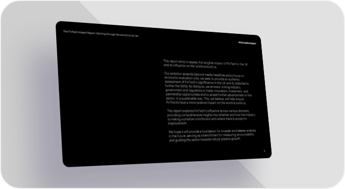 The FinTech Impact Report: Working through the world’s to-do list #FinTechforImpact This report aims to assess the tangible impact of FinTech in the UK and its influence on the world around us. Our ambition extends beyond media headlines and a focus on economic evaluation only; we seek to provide an authentic assessment of FinTech’s significance in the UK and its potential to further the SDGs. By doing so, we envision uniting industry, government and regulators to foster innovation, investment and partnership opportunities and to propel further advancement in the sector, in a sustainable way. This, we believe, will help ensure FinTechs have a more positive impact on the world around us. This report explores FinTech’s influence across various domains, providing comprehensive insights into whether and how the industry is making a positive contribution and where there is scope for improvement. We hope it will provide a foundation for broader and deeper analysis in the future, serving as a benchmark for measuring accountability and guiding the sector towards robust positive growth. 10