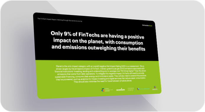 The FinTech Impact Report: Working through the world’s to-do list #FinTechforPlanet Only 9% of FinTechs are having a positive impact on the planet, with consumption and emissions outweighing their benefits Planet is the only impact category with an overall negative Net Impact Rating (NIR) in our assessment. This is driven largely by the emissions impact of FinTech. Indirect greenhouse gas (GHG) emissions associated with 37 financial institutions’ investing, lending and underwriting are on average over 700 times higher than the direct emissions that come from daily operations. To mitigate this negative impact, FinTechs will need to provide sustainable financing, consume clean energy and minimise e-waste. They will also need to extend the practices they’ve pioneered, such as analytics for Impact Investing and digital services that reduce paper consumption. They should also minimise the need for travel between physical places.
