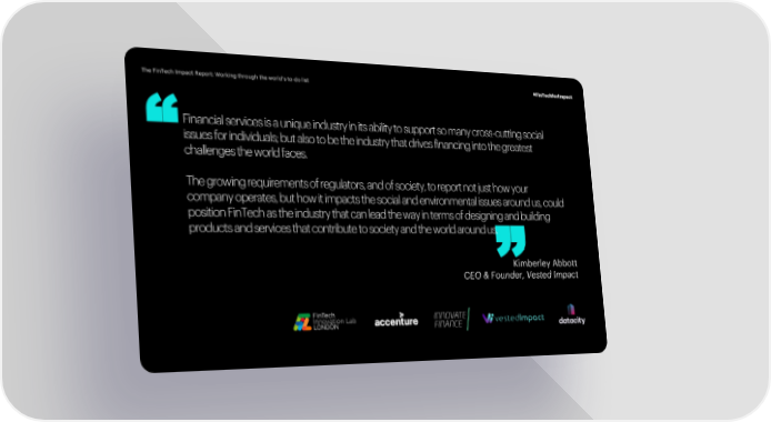 The FinTech Impact Report: Working through the world’s to-do list #FinTechforImpact Financial services is a unique industry in its ability to support so many cross-cutting social issues for individuals; but also to be the industry that drives financing into the greatest “challenges the world faces. The growing requirements of regulators, and of society, to report not just how your “ company operates, but how it impacts the social and environmental issues around us, could position FinTech as the industry that can lead the way in terms of designing and building products and services that contribute to society and the world around us. Kimberley Abbott CEO & Founder, Vested Impact