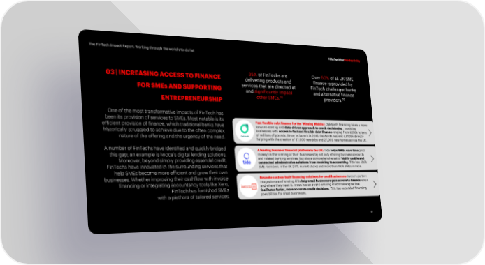 The FinTech Impact Report: Working through the world’s to-do list #FinTechforProductivity 03 | INCREASING ACCESS TO FINANCE 35% of FinTechs are Over 50% of all UK SME delivering products and finance is provided by FOR SMEs AND SUPPORTING services that are directed at FinTech challenger banks and significantly impact and alternative finance 78 79 ENTREPRENEURSHIP other SMEs. providers. One of the most transformative impacts of FinTech has been its provision of services to SMEs. Most notable is its Fast flexible debt finance for the ‘Missing Middle’: OakNorth financing takes a more efficient provision of finance, which traditional banks have forward-looking and data-driven approach to credit decisioning, providing historically struggled to achieve due to the often complex businesses with access to fast and flexible debt finance ranging from £250k to tens nature of the offering and the urgency of the need. of millions of pounds. Since its launch in 2015, OakNorth has lent c.£10bn directly helping with the creation of 37,000 new jobs and 27,000 new homes across the UK. A number of FinTechs have identified and quickly bridged A leading business financial platform in the UK: Tide helps SMEs save time (and money) in the running of their businesses by not only offering business accounts this gap; an example is Iwoca’s digital lending solutions. and related banking services, but also a comprehensive set of highly usable and Moreover, beyond simply providing essential credit, connected administrative solutions from invoicing to accounting. Tide has 550k FinTechs have innovated in the surrounding services that SME members in the UK (10% market share) and more than 150k SMEs in India. help SMEs become more efficient and grow their own businesses. Whether improving their cashflow with invoice Bespoke custom-built financing solutions for small businesses: Iwoca’s partner financing or integrating accountancy tools like Xero, integrations and lending APIs help small businesses gain access to finance when and where they need it. Iwoca has an award-winning credit risk engine that FinTech has furnished SMEs facilitates faster, more accurate credit decisions. This has expanded financing with a plethora of tailored services. possibilities for small businesses. 42