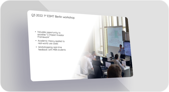 • Valuable opportunity to socialise “U Impact Investor Framework” • Academic theory applied to real - world use cases • Workshopping real - time feedback with MBA students Q3 2022: 1 st ESMT Berlin workshop Confidential