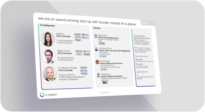 Advisors Rebecca Self Advisor : Sustainable Finance Former CFO Sustainable Finance HSBC Laurence Norman Advisor : Data and Large Client Engagement Vice President NTT Data Impact Koldo Oleaga Advisor : Banks and Institutions Chief Financial Officer Santander Consumer Bank Italy Chengwei Liu Advisor : Behavioural Sciences Professor Strategy and Behaviour Sciences ESMT Berlin Founding team Dr. Clemens Chaskel CTO & Cofounder 15+ years experience in R&D, strategy, technology and innovation management Alistair Hume COO & Cofounder 10+ years experience in financial services Lesley Li CEO & Cofounder 10+ years experience in financial services We are an award - winning start - up with founder - market fit to deliver We have extensive experience in the financial sector, as well as in strategic technology and innovation management. With us, you can discuss your strategic and product needs at eye - level. Experienced team 20+ years Combined financial sector experience 15+ years technology and innovation management experience Expert advisors 4 We have expert advisors across all disciplines Why us Confidential