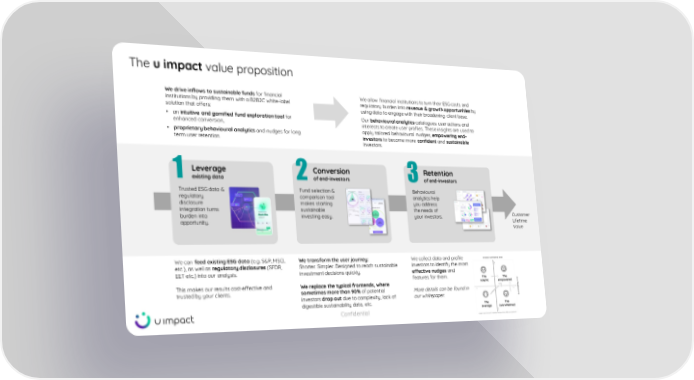 The u impact value proposition We drive inflows to sustainable funds for financial institutions by providing them with a B2B2C white - label solution that offers: • an intuitive and gamified fund exploration tool for enhanced conversion, • proprietary behavioural analytics and nudges for long term user retention. We allow financial institutions to turn their ESG costs and regulatory burden into revenue & growth opportunities by using data to engage with their broadening client base. Our behavioural analytics catalogues user actions and interests to create user profiles. These insights are used to apply tailored behavioural nudges, empowering end - investors to become more confident and sustainable investors. Leverage existing data 1 Conversion of end - investors 2 Retention of end - investors 3 Customer Lifetime Value We transform the user journey: Shorter. Simpler. Designed to reach sustainable investment decisions quickly. We replace the typical frontends, where sometimes more than 90% of potential investors drop out due to complexity, lack of digestible sustainability data, etc. We collect data and profile investors to identify the most effective nudges and features for them. More details can be found in our whitepaper. We can feed existing ESG data (e.g. S&P, MSCI, etc.), as well as regulatory disclosures (SFDR, EET etc.) into our analysis. This makes our results cost - effective and trusted by your clients. Confidential Trusted ESG data & regulatory disclosure integration turns burden into opportunity. Fund selection & comparison tool makes starting sustainable investing easy. Behavioural analytics help you address the needs of your investors.