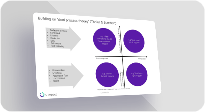 Building on “dual process theory” (Thaler & Sunstein) Non - transparent Transparent Reflective thinking (e.g. choices) Automatic thinking (e.g. unconscious) Adapted from Hansen & Jespersen, 2013, “Nudge and the Manipulation of Choice” e.g. “true, good point” triggers e.g. “I feel something should be considered” triggers e.g. “Shifted default” triggers e.g. “that looks right” triggers • Uncontrolled • Effortless • Associative Fast • Unconscious • Skilled • Reflective thinking • Controlled • Effortful • Deductive • Slow • Self - aware • Rule following Confidential