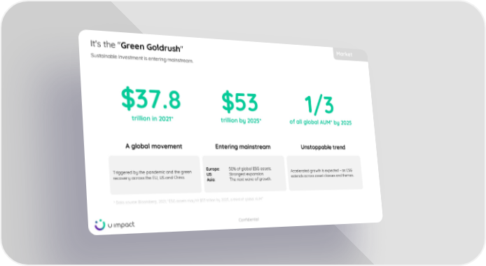 It's the " Green Goldrush " Entering mainstream Unstoppable trend A global movement 1/3 of all global AUM* by 2025 $53 trillion by 2025* $37.8 trillion in 2021* Europe : 50% of global ESG assets. US : Strongest expansion. Asia : The next wave of growth. Accelerated growth is expected – as ESG extends across asset classes and themes. Triggered by the pandemic and the green recovery across the EU, US and China. Sustainable investment is entering mainstream . * Data source: Bloomberg, 2021, “ESG assets may hit $53 trillion by 2025, a third of global AUM” Market Confidential