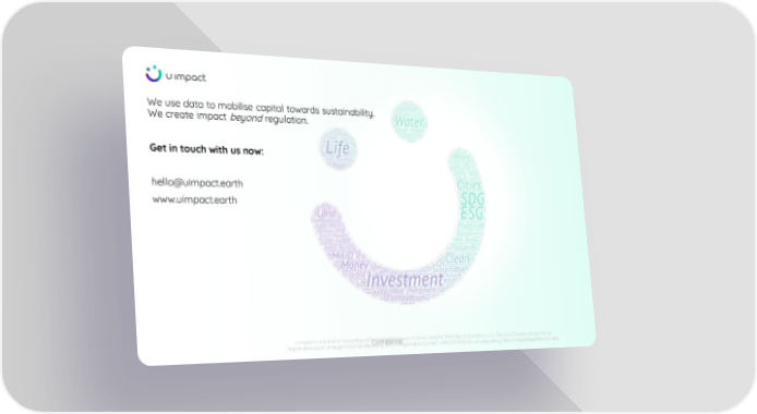 https://www.youtube.com/watch?v=qp0HIF3SfI4&t=21s u impact is a brand of impact4good GmbH, Gottfried - von - Cramm - Weg 45, 14193 Berlin. Directors: Lu Li, Clemens Chaskel, Alistair Hume. Registration court: Amtsgericht Charlottenburg, Berlin. Registration number: HRB 229776 B. Our privacy policy: https://impact4good.eu/privacy. We use data to mobilise capital towards sustainability. We create impact beyond regulation. Get in touch with us now: [email protected] www.uimpact.earth Confidential