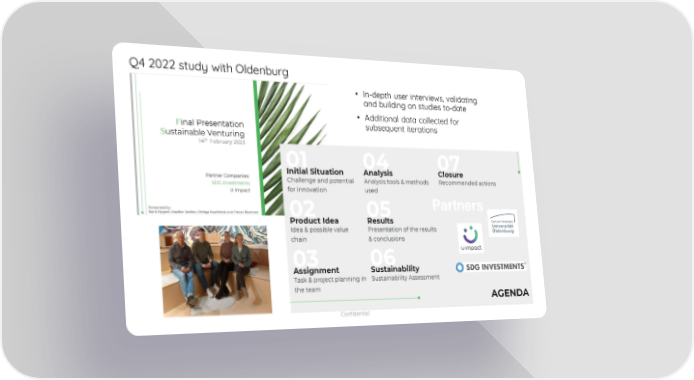U Impact Pitch Deck Page 15 Page 17Q4 2022 study with Oldenburg Partners • In - depth user interviews, validating and building on studies to - date • Additional data collected for subsequent iterations Confidential