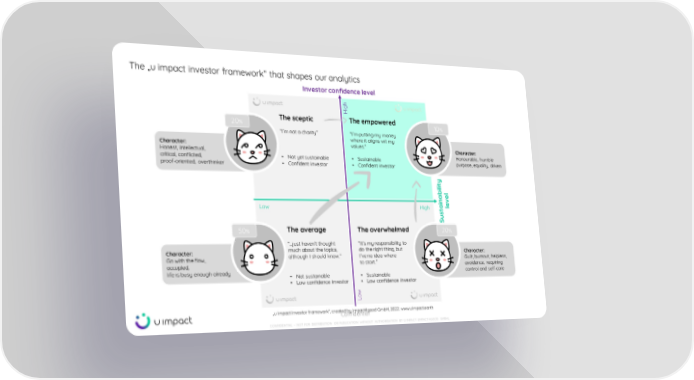The „u impact investor framework “ that shapes our analytics CONFIDENTIAL – NOT FOR DISTRIBUTION OR PUBLICATION WITHOUT AUTHORISATION BY U IMPACT (IMPACT4GOOD GMBH). Character: Guilt, burnout, helpless, avoidance, requiring control and self - care Character: Honourable, humble purpose, equality, driven Character: Go with the flow, occupied, life is busy enough already Character: Honest, intellectual, critical, conflicted, proof - oriented, overthinker Investor confidence level Sustainability level Low High Low High The sceptic “I’m not a charity” • Not yet sustainable • Confident investor The empowered “I’m putting my money where it aligns wit my values.” • Sustainable • Confident investor The average “...just haven’t thought much about the topics, although I should know.” • Not sustainable • Low confidence investor The overwhelmed “It’s my responsibility to do the right thing, but I’ve no idea where to start.” • Sustainable • Low confidence investor 20 % 50 % 10 % 20 % „u impact investor framework“, created by impact4good GmbH, 2022. www.uimpact.earth Confidential