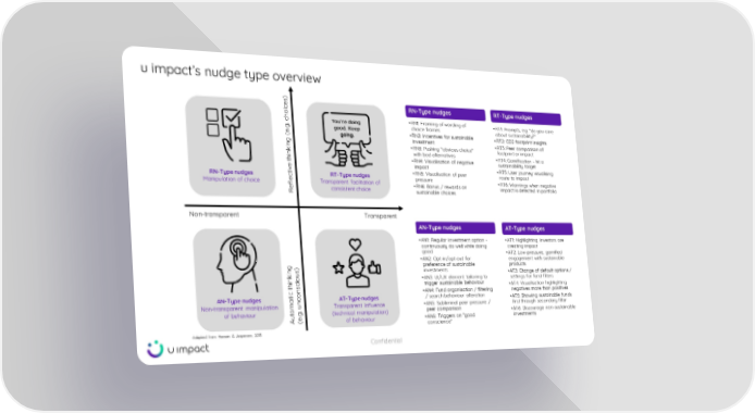 u impact’s nudge type overview Non - transparent Transparent Reflective thinking (e.g. choices) Automatic thinking (e.g. unconscious) Adapted from Hansen & Jespersen, 2013 RN - Type nudges Manipulation of choice RT - Type nudges Transparent facilitation of consistent choice AN - Type nudges Non - transparent manipulation of behaviour AT - Type nudges Transparent influence (technical manipulation) of behaviour You’re doing good. Keep going. RT - Type nudges • RT1: Prompts, e.g. "do you care about sustainability?" • RT2: CO2 footprint insights • RT3: Peer comparison of footprint or impact • RT4: Gamification - hit a sustainability target • RT5: User journey visualising route to impact • RT6: Warnings when negative impact is detected in portfolio RN - Type nudges • RN1: Framing of wording of choice frames • RN2: Incentives for sustainable investment • RN3: Pushing "obvious choice" with bad alternatives • RN4: Visualisation of negative impact • RN5: Visualisation of peer pressure • RN6: Bonus / rewards on sustainable choices AT - Type nudges • AT1: Highlighting investors are creating impact • AT2: Low - pressure, gamified engagement with sustainable products • AT3: Change of default options / settings for fund filters • AT4: Visualisation highlighting negatives more than positives • AT5: Showing sustainable funds first through secondary filter • AT6: Discourage non - sustainable investments AN - Type nudges • AN1: Regular investment option - continuously do well while doing good • AN2: Opt - in/opt - out for preference of sustainable investments • AN3: UI/UX element tailoring to trigger sustainable behaviour • AN4: Fund organisation / filtering / search behaviour alteration • AN5: Subliminal peer pressure / peer comparison • AN6: Triggers on "good conscience" Confidential