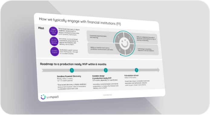 How we typically engage with financial institutions (FI) Through our strategic alliances, we can tap into a wealth of digital implementation expertise to accelerate deployment and compliance, whilst demonstrating a commitment to innovation at the bank by underwriting the outcomes of the project. Roadmap to a production ready MVP within 6 months Sandbox Powered Discovery Ready within 2 weeks, for 1 - 3 months period. Time boxed discovery & digital readiness assessment to prove value of innovative sustainable investment suite. Scalable design & production - ready MVP 3 - 9 months, depending on specification Innovative, outcome - based commercial propositions to reduce the financial and delivery risk to the FI. Full solution roll - out Within 12 - 18 months Scaled data driven sustainable investment exploration and behavioural analytics suite for your chosen fund universe. 1 2 3 Pilot Technology & regulatory adaptation and accreditation. Ability to transfer from test to production environments with ease. Ability to understand the product and build customisations on top of existing functionality. Customer experimentation and learning. 1 2 3 4 Time boxed discovery & digital readiness assessment to define a strong business case & KPI benefits framework. Rapid proof of value Innovative, outcome based commercial propositions to reduce the financial and delivery risk to the FI. De - risk the MVP delivery Dedicated support service from MVP launch, through to a scaled solution. Scalable Support Confidential